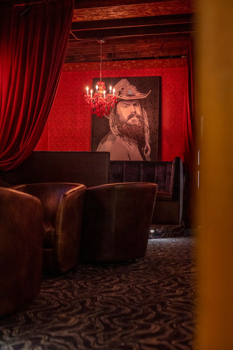 Hence the booth seating lined with velvet material, the massive painting of legendary singer Johnny Cash on a brick wall, and a dedicated area for live musical acts.